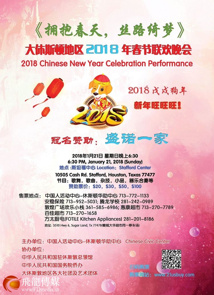 2018 拥抱春天春节晚会是为庆祝2018年春节而举办的大型综艺晚会,是由中国人活动中心主办-休斯顿华助中心主办,由中华人民共和国驻休斯顿总领馆,中华人民共和国侨务办公室,休斯顿地区60多家艺术团体及各大社团协办,支持并参与的一项大型活动。今年晚会时间是2018年1月21日,周日晚上6:30pm-9:30pm,在Stafford Center,10505 Cash Rd.,Stafford,TX 77477 举办。将有政界人士,成功的企业家及社区各界人士一千多人参加。