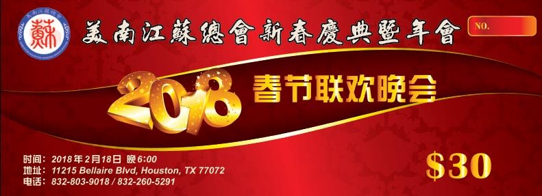 《旧岁又添几个喜 新年更上一层楼》 美南江苏总会将于2018年2月18日晚6点在(珍宝楼)举行年会暨会长换届交接仪式。美南江苏总会自成立以来得到了中国驻休斯敦总领馆、各社团及全休斯敦华侨华人的大力支持,总会越来越强大。美南江苏总会主办了“休斯敦公祭南京大屠杀遇难者80周年”等活动,总会每年参与和支持侨界各种活动数十次,与各兄弟社团携手同行!成为繁荣侨界,创造和谐社区的一股力量。同时美南江苏总会也是休斯敦江苏老乡一个温馨的港湾。