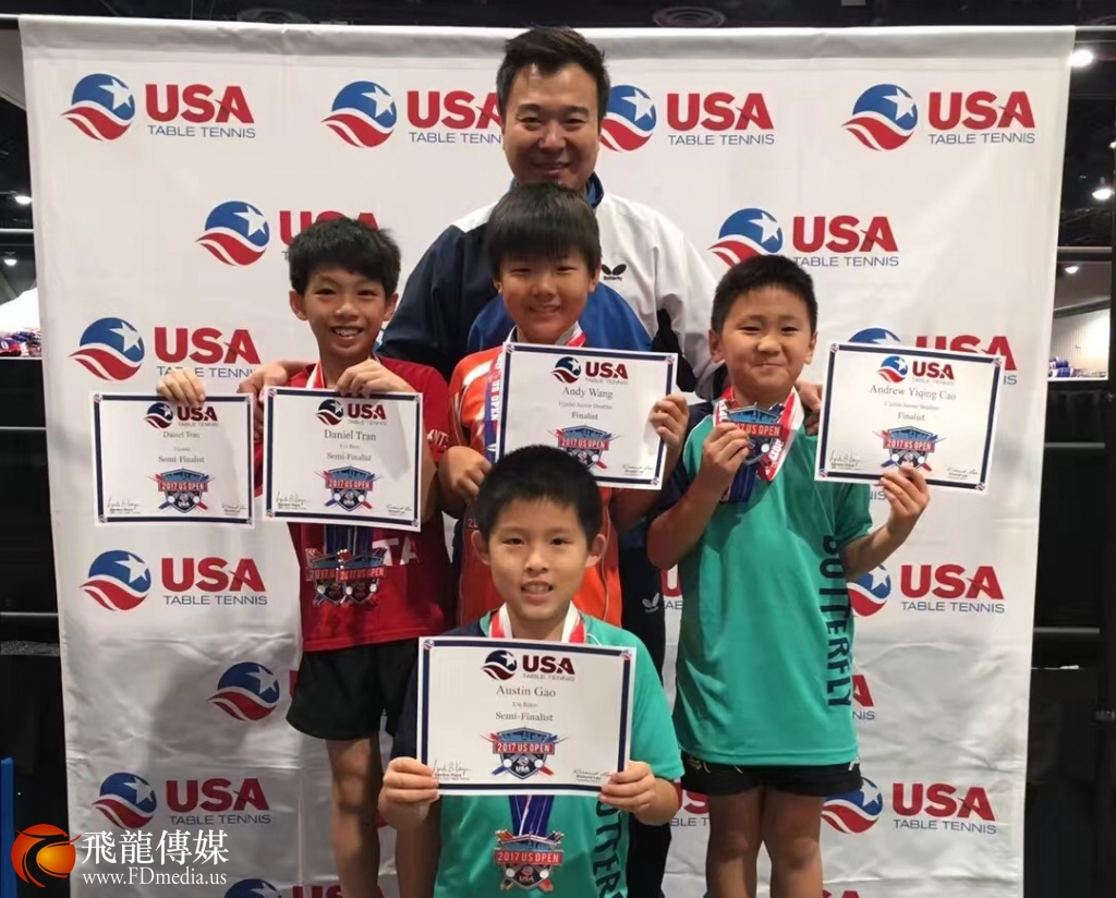 Austin Gao妈妈:Austin Gao 第一次参加大型的比赛,在9岁以下(含9岁)组的比赛中打进了半决赛,这背后是 Austin 无数的汗水,是教练们不懈的努力。记得去年夏天 Austin 刚到 HITTA 的时候,不喜欢打球,经常会钻到球台下面玩或者满球馆的疯跑,HITTA 校长兼主教练王辉费了不少的心思,软硬兼施,Austin 逐渐爱上了乒乓球。主教练王辉和他的教练们不仅自身球艺精湛,在小球员的训练上更有一套,寓教于乐的同时,追求训练质量,培养孩子的意志品质力。王辉曾说过,他更看重的是球员的态度,比赛是不是尽全力了,是不是每分必争,落后也好,遇到困难也好,是否能顶得住,不放弃。对于 Austin 来说,2017 US Open 仅仅是一个开始,他未来的路还很长。希望以后他打球也好,工作生活也好,在逆境时在遇到困难时,不气馁,能够顶住压力,继续前行。