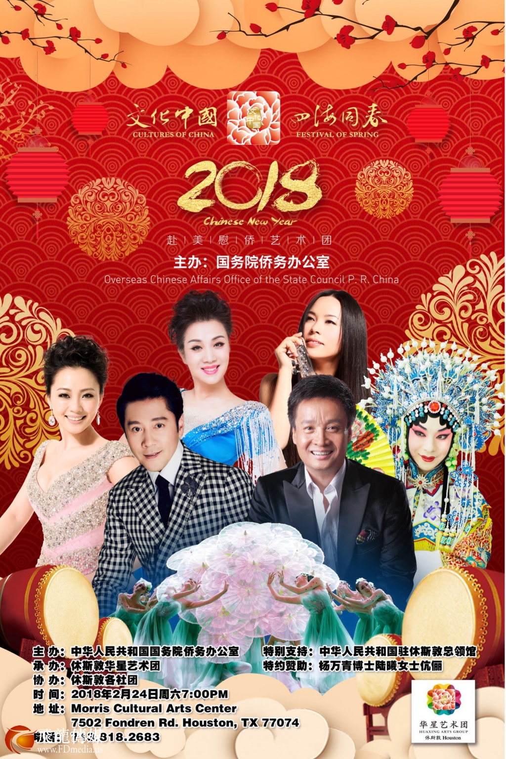 由中国国务院侨办和中国海外交流协会主办、中国驻 休斯敦总领馆特别支持、休斯敦华星艺术团承办的 2018 年《文化中国 · 四海同春》大型综艺晚会,将于 2018 年2 月24 日星期六在HBU 摩瑞斯文化艺术中心 隆重举行。