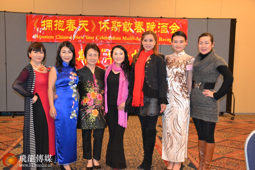 左起:湖南同乡会前会长吴安萍、美南江苏总会会长陈韵梅、休斯敦华星艺术团团长、著名歌唱家樊豫珍、飞龙传媒负责人陈铁梅、AIG利娅萁、河南同乡会会长张燕晓合影。