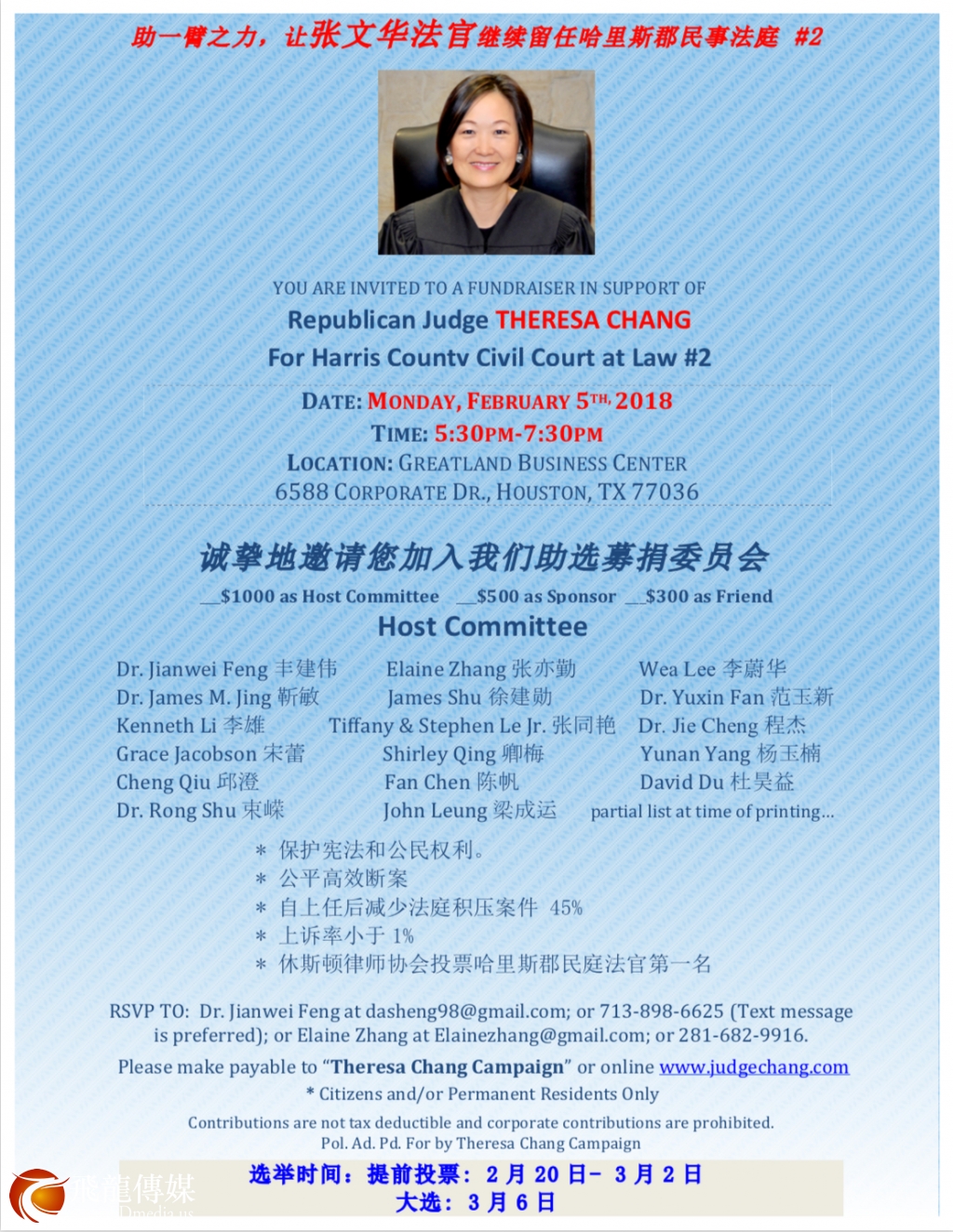在休斯敦提到张文华法官几乎没有一个华人不认识她,张文华法官,2012年担任哈瑞斯县第二民事法院(Harris County Civil Court at Law #2)法官以来,她一直对华裔社区在做服务,多年的判案经历,让她懂得如何在法律框架内寻求正义。张文华再次参选连任,希望能得到华裔社区的支持,能为华裔社区发声。同时,她对自己的工作很有信心,认为一定不会让支持者失望。