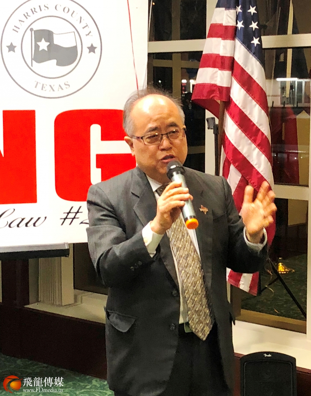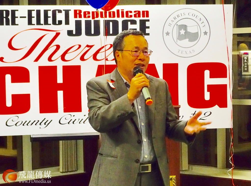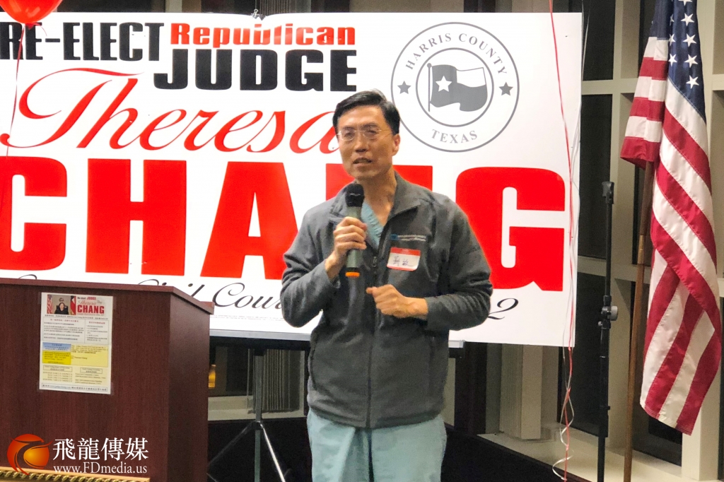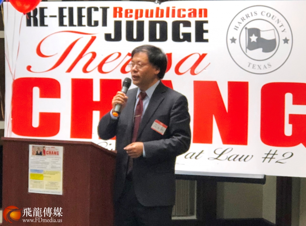 德州中国和平统一促进会前会长邓润京发言,并且代表粱氏基金会美国分会主席粱成运对张文华大法官的连任表示支持。