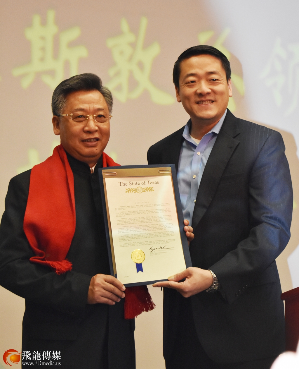 德州州议员吴元之(右)带来祝农历新年的贺状,李强民总领事其中接收。
