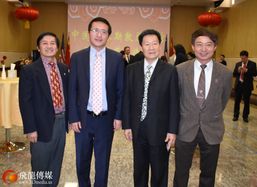 左起;北美台湾乡亲联谊会休斯敦分会会长 刘志恒、总领馆侨务组组长房震群、侨务领事易川、德州中国和平统一促进会会长浦浩德合影。