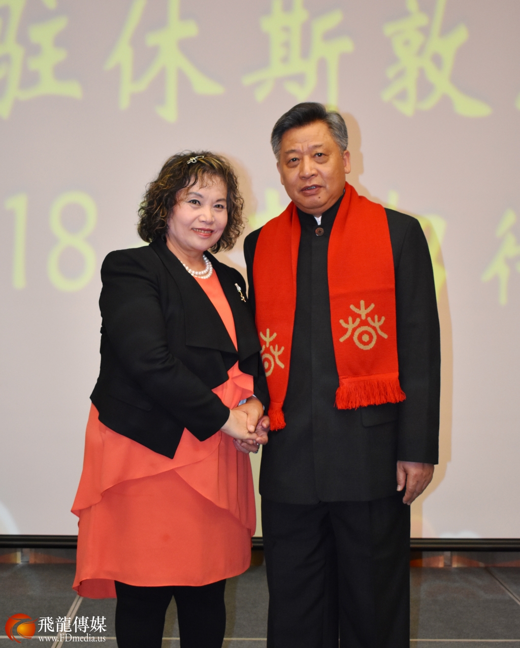 五邑同乡会会长戴慧怡与总领事李强民合影。