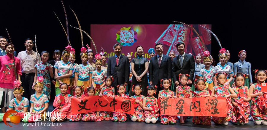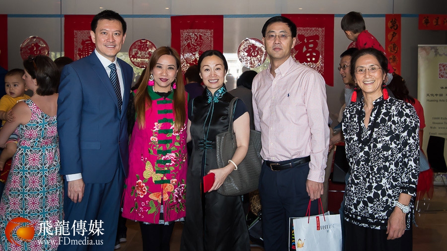 中国驻休斯敦总领事馆总领事李强民(图中左一),东方艺术教育学院校长徐利(左二)、副总领事王昱(右二)、中国人活动中心董事长靳敏(右一)出席《文化中国 华星闪耀》-休斯顿2018春节庆典。