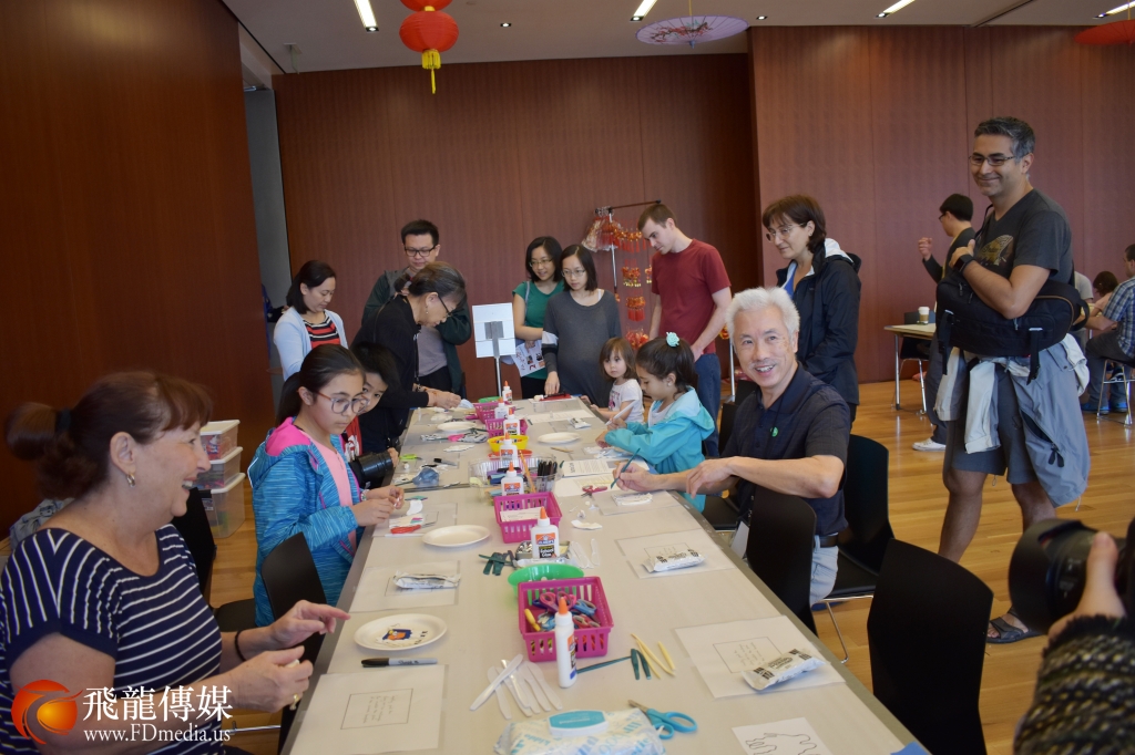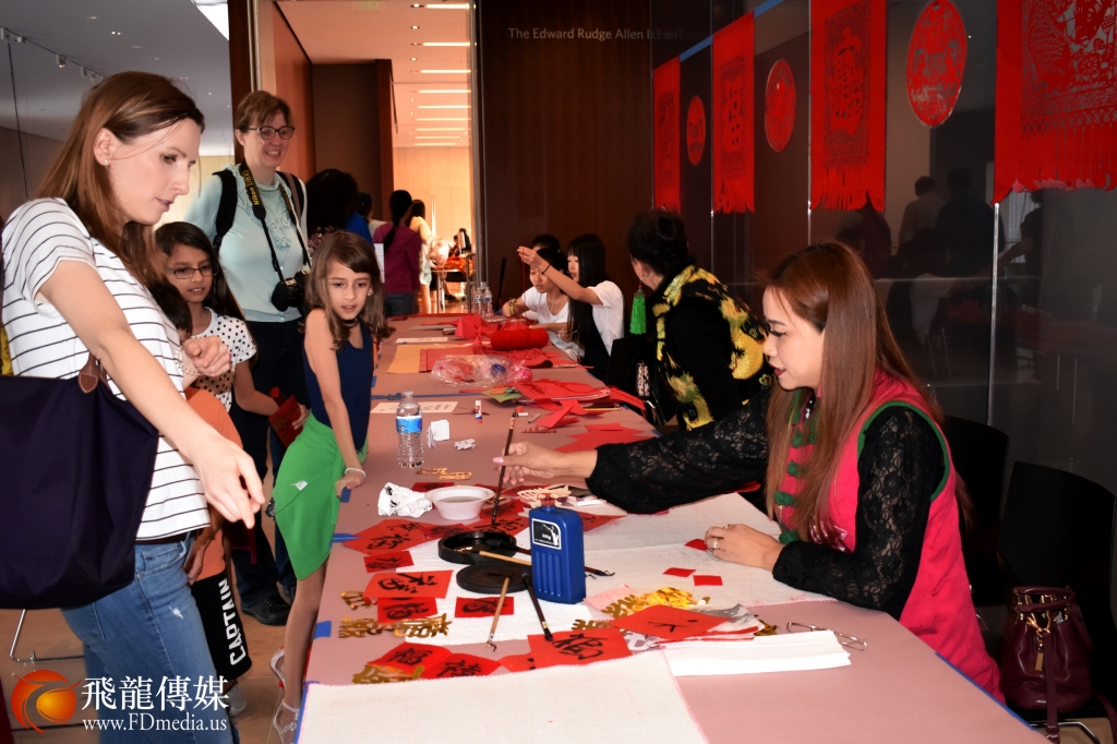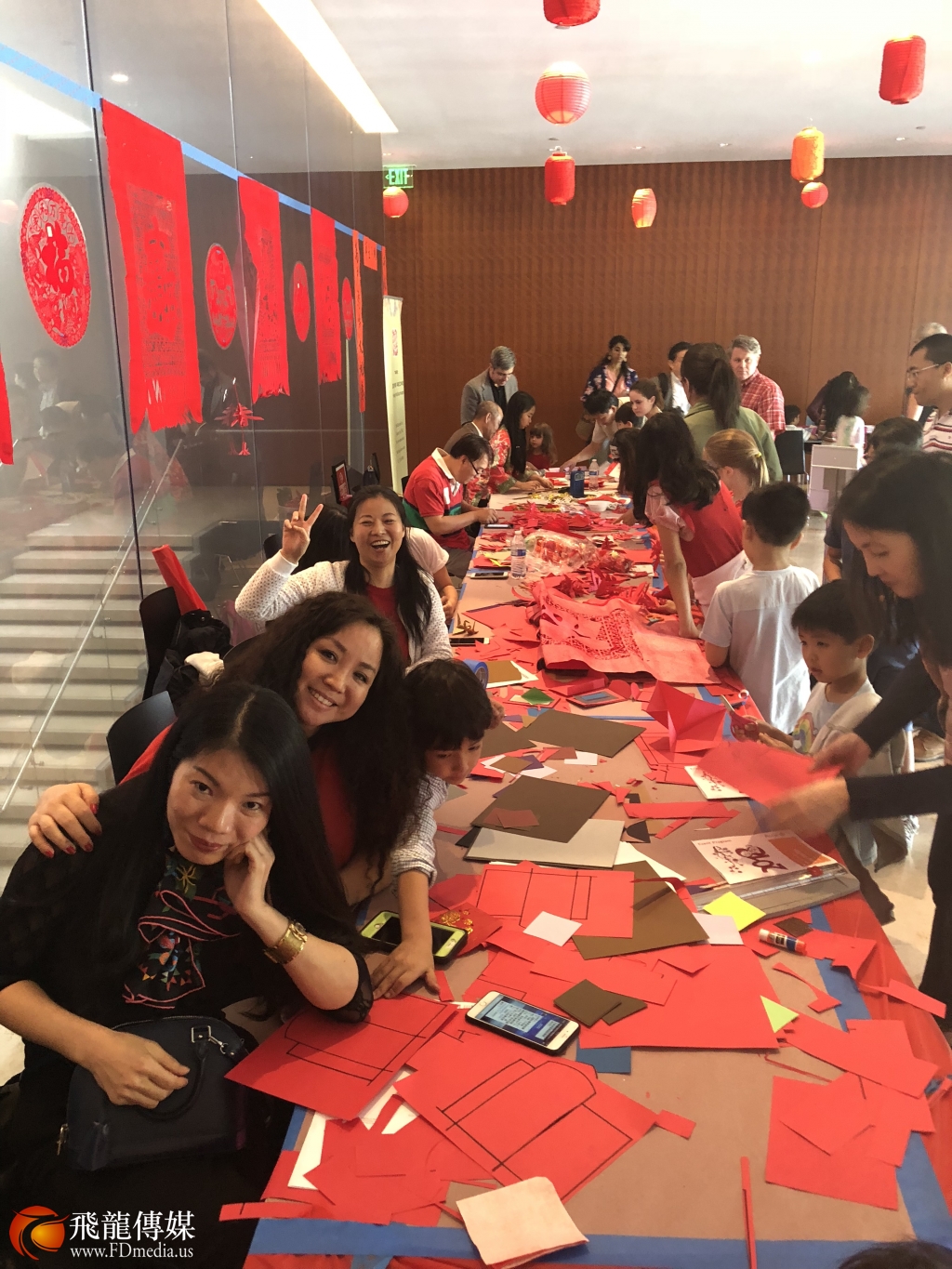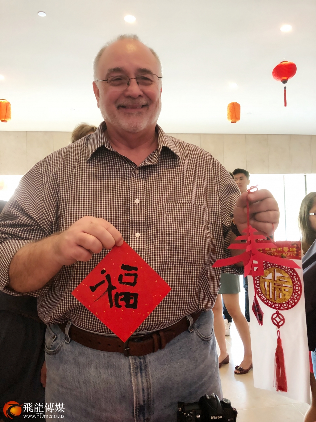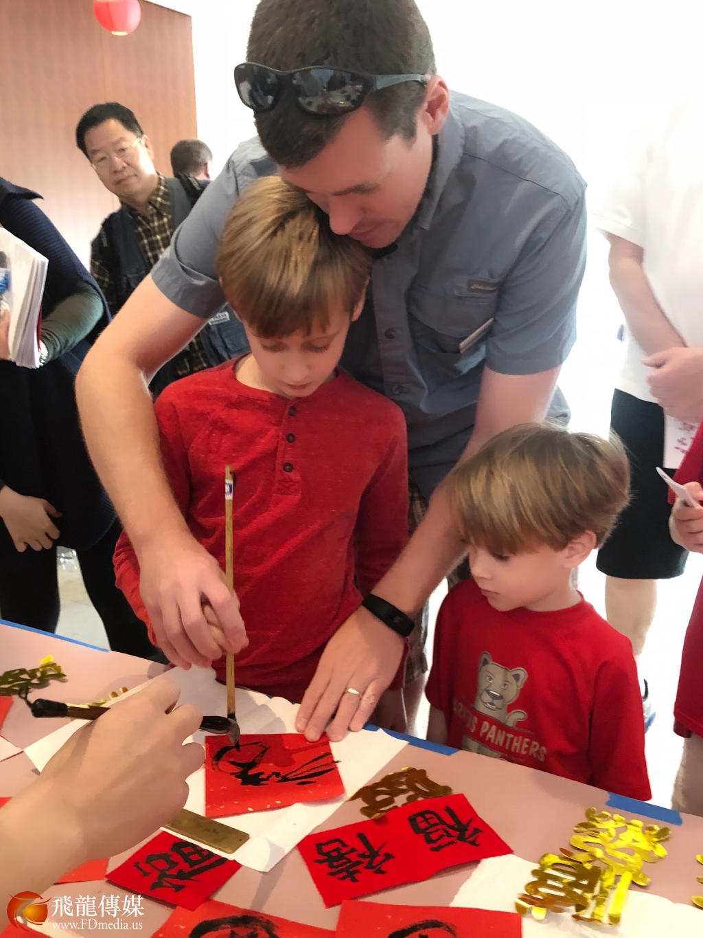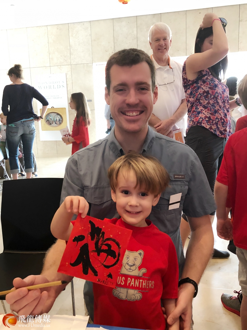 手工叠纸摊位前排了成龙,黄鑫老师现场教写书法,热闹非凡,老外带着小朋友亲手学写“福”字带回家,还有外国人把他们的名字给我们帮助翻译成中文名字,然后写在红纸上,兴高采烈的拿着自拍。这就是中华文化的魅力!