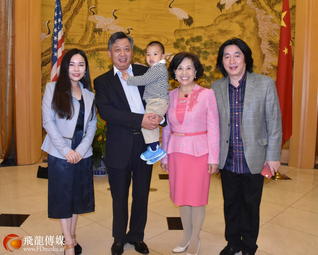 李强民总领馆与夫人曾红燕抱着孙子与著名钢琴家洪兵、歌唱家郭蓉合影留念。(小珑 摄影)