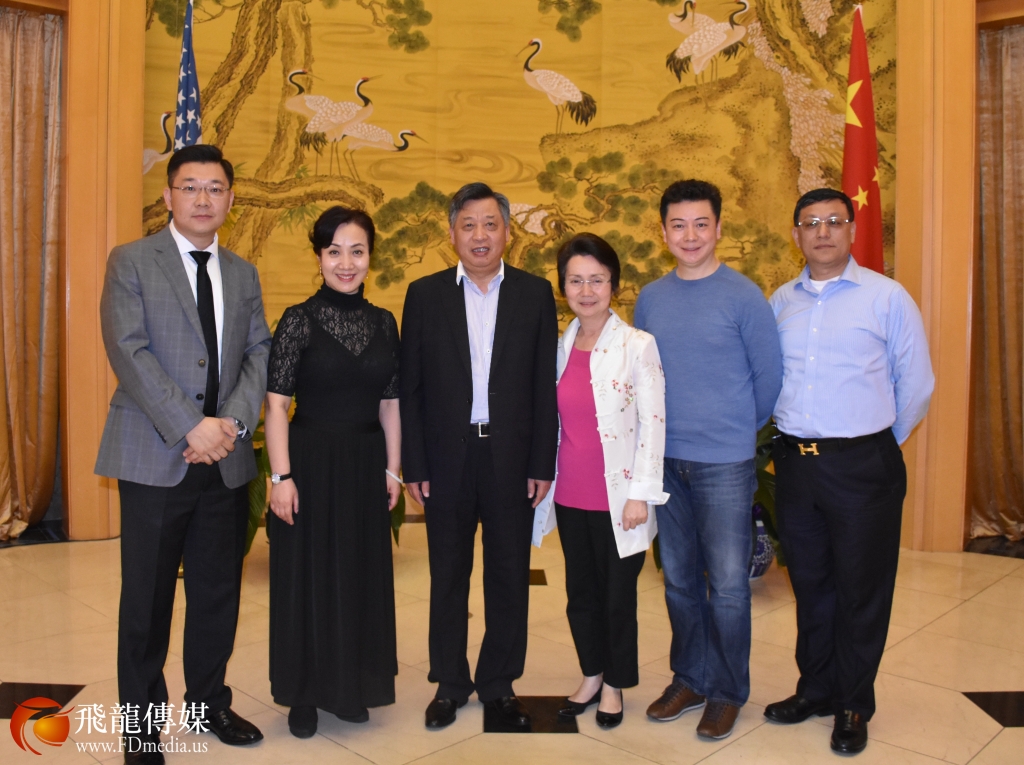 左起:天庆集团总经理David Du、著名歌唱家 马晓晨、李强民总领事、鲍玲团长、著名京剧表演艺术家胡文阁、杨万青博士。(小珑 摄影)