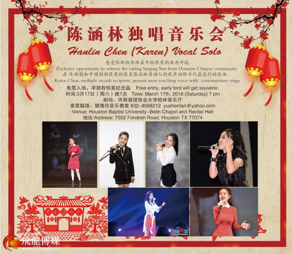 3月17日,陈涵林在Houston Baptist University有一场个人演唱会,免费入场,请大家支持她实现梦想。地址:7502 Fondren Rd,Houston,TX 77074