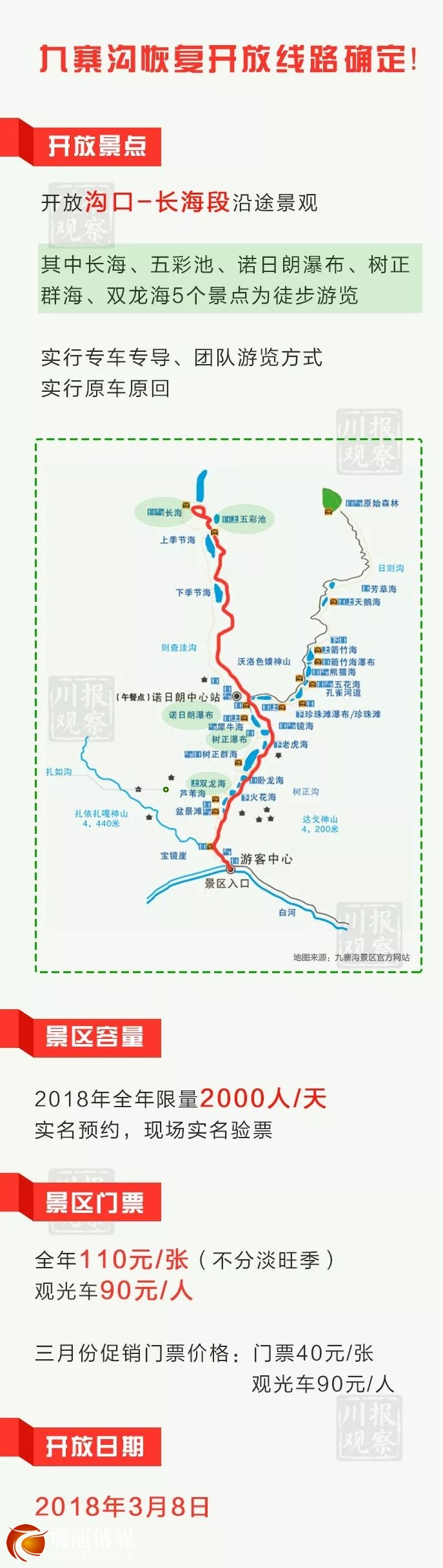 2月28日,川报观察记者从多个渠道了解到,从3月8日起,关闭了近7个月的九寨沟景区部份景观将恢复开放。景区开放区域为九寨沟景区沟口至长海段沿途景观,实行专车专导,团队游览方式,全年游客接待限量为每天2000人。其中长海、五彩池、诺日朗瀑布、树正群海、双龙海5个景点为徒步游览。景区门票价格不分淡旺季,全年为110元/张,观光车价格为90元/张。其中3月份实行促销门票价格,门票为40元/张,观光车价格不变。徒步游览的长海、五彩池、诺日朗瀑布、树正群海、双龙海5个景点,川报观察带你先提前一饱眼福!请把手机横过来看大图哦!2月初,冰封的长海如同素雅的国画。↓↓↓