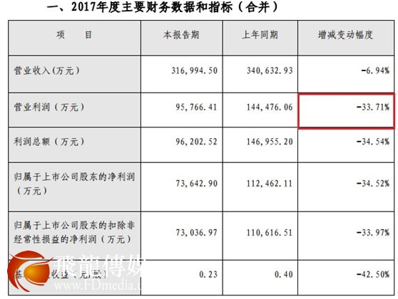 公司2017年度实现营业收入31.70亿元,较上年同期的34.06亿元减少了6.94%;归属于上市公司股东的净利润7.36亿元,较上年同期的11.25亿元减少了34.52%。净利润减少幅度较大的主要原因为本年度计提金融资产减值准备较多所致。