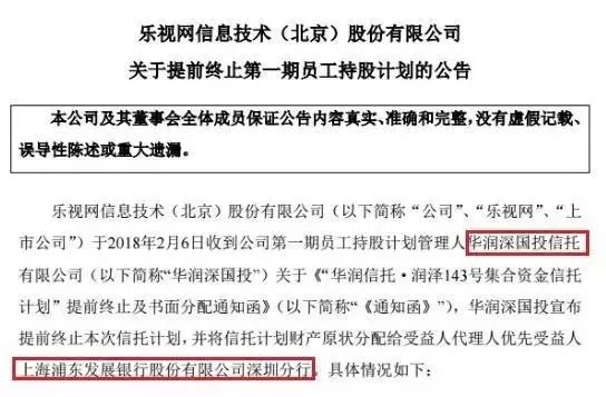 后来乐视网公告称,提前终止为乐视网员工持股计划提供的优先级配资,将信托计划财产原状分配给受益人——浦发银行深圳分行。