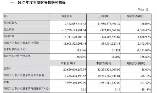 具体来看,乐视网2017年实现营业总收入74.62亿元,较去年同期下降66.06%;营业利润为-157.6亿元,较去年同期下降4569.40%;利润总额-157.4亿元,较去年同期减少4688.90%;归属于上市公司股东的净利润为-116.08亿元,较去年同期减少2192.53%;基本每股收益为-2.9146元,比去年同期减少2151.09%。