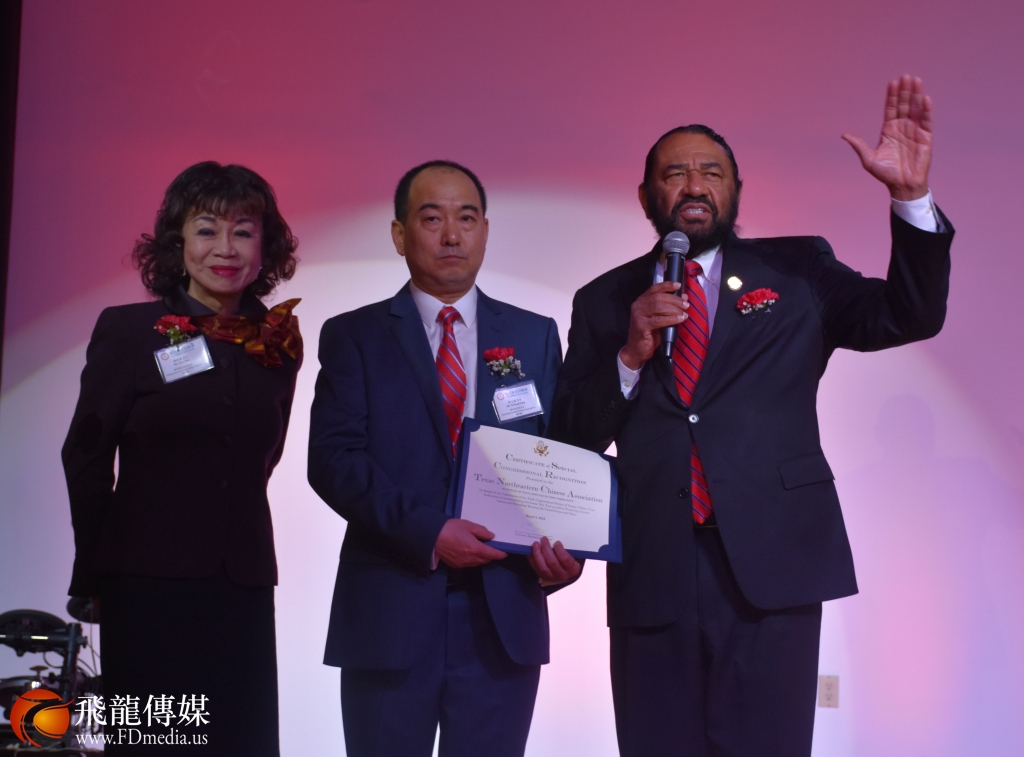 国会议员Al Green亲自送来褒奖状,由会长张玉诚上台接受,他的亚裔助理谭秋晴翻译。