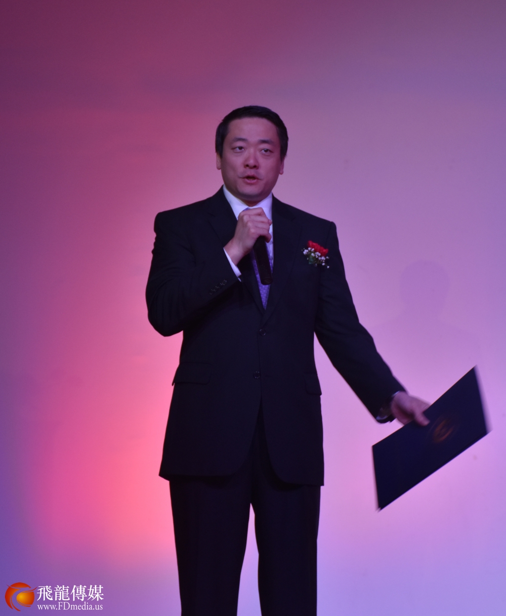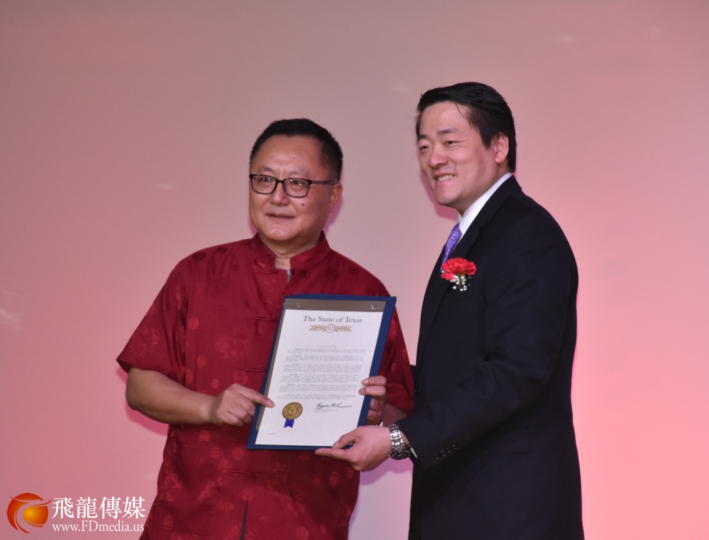 同乡会负责人Michael Qian上台领受德州州议员吴元之颁发褒奖状。