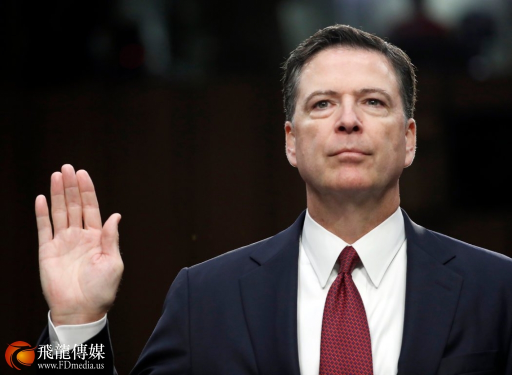 2017年6月8日,华盛顿,前FBI局长詹姆斯·科米在参议院情报委员会听证会上宣誓。 ALEX BRANDON/ASSOCIATED PRESS