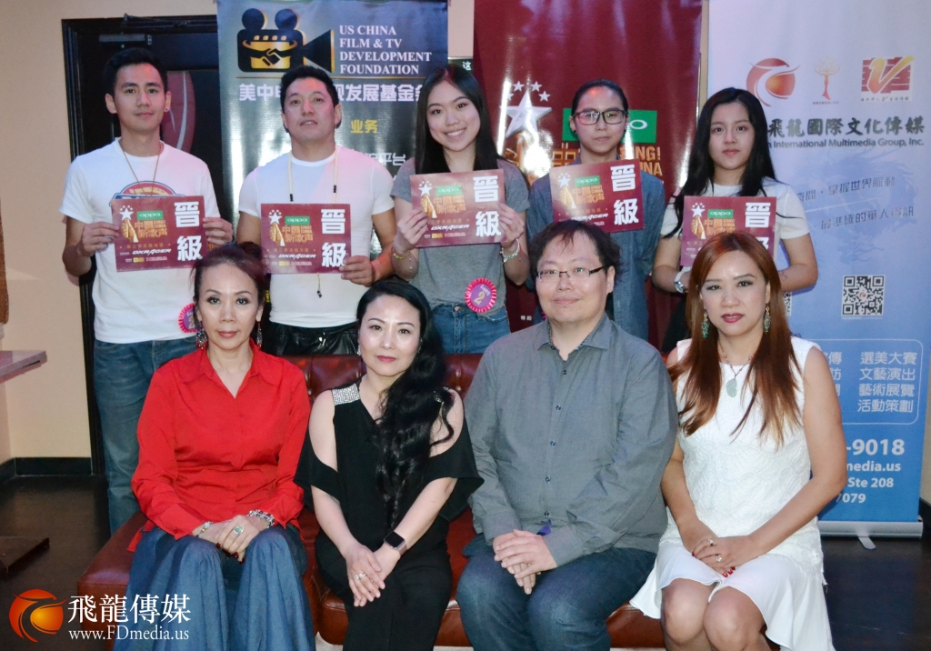 前排左起: 美中电影电视发展基金会主席查忠华、评委樊豫珍老师、评委廖小可老师、飞龙传媒负责人陈铁梅女士。获得《中国新歌声》美国唱区德州海选五强的选手是:2号 熊楚琪(弗吉尼亚州)、3号 扎西多杰(乔治亚州)、6号 陈涵林、21号 肖晓、22号 蒲嘉恩。