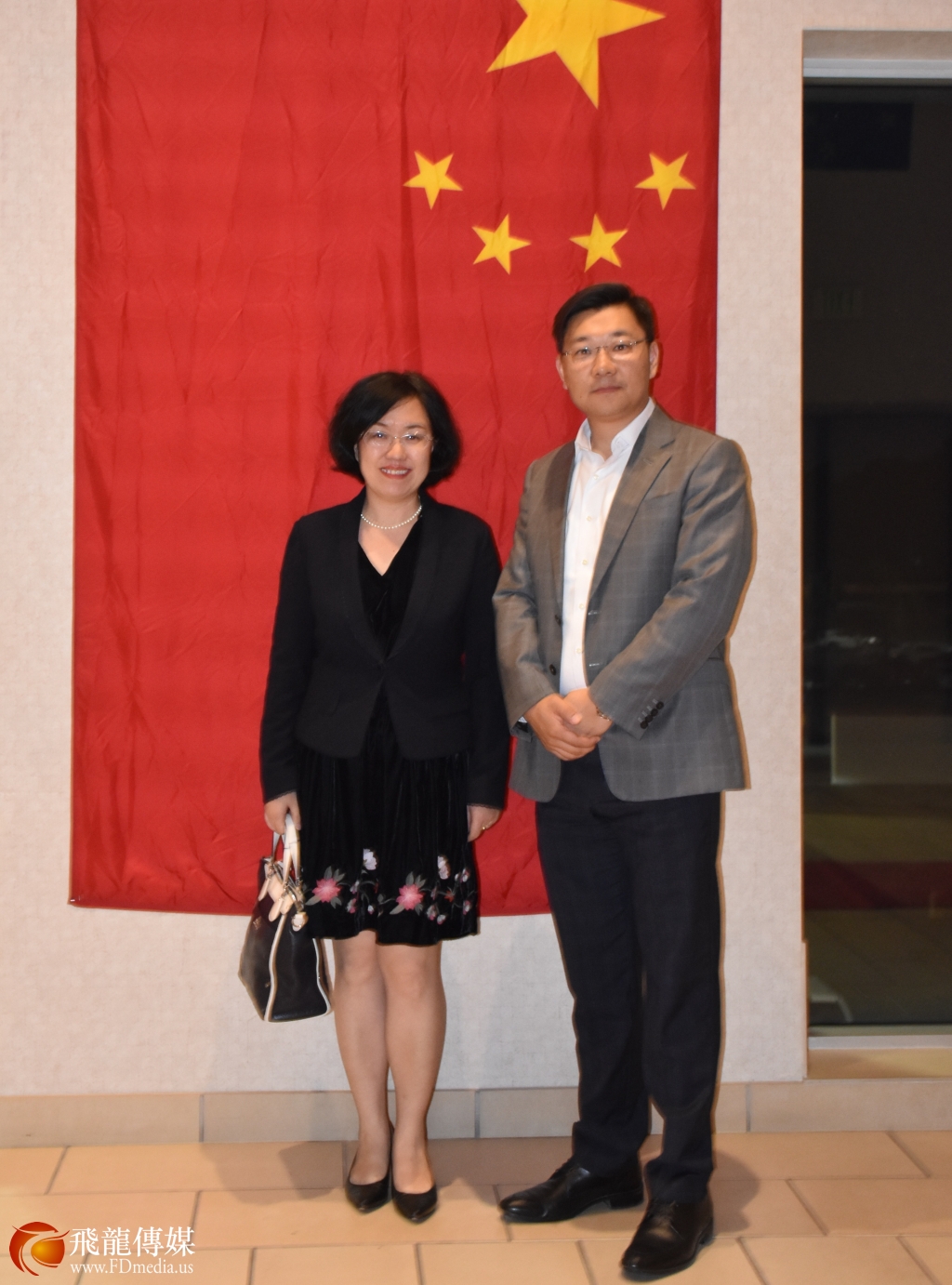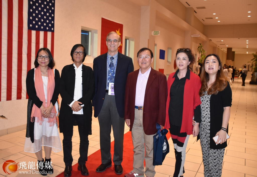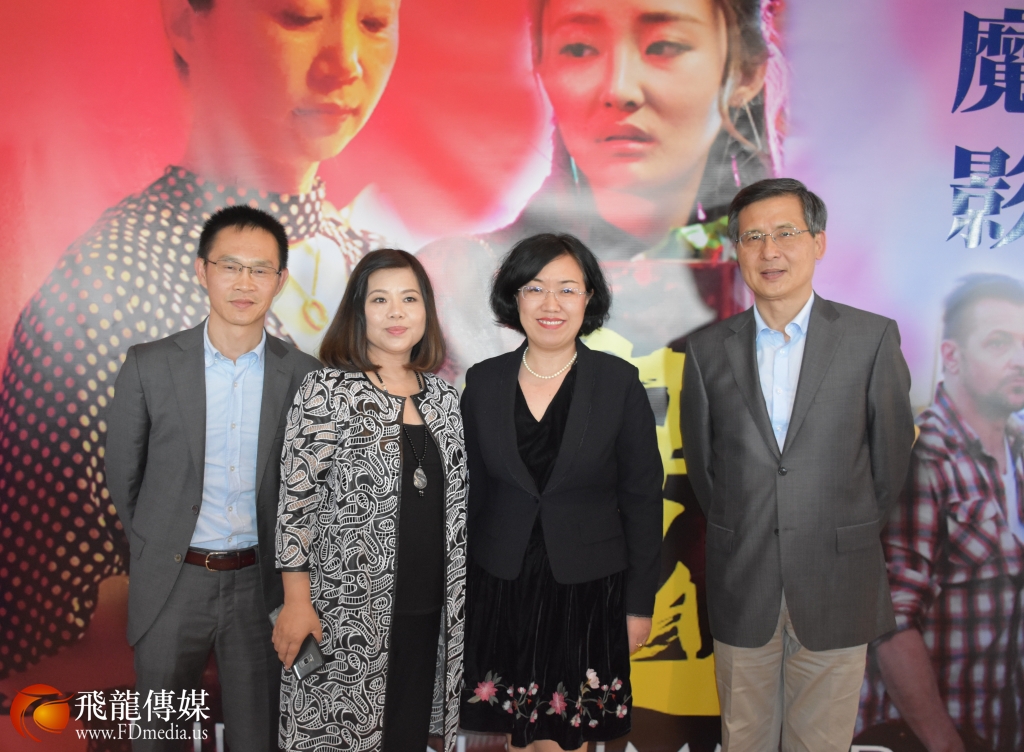 图右起:中国驻休斯敦总领馆文化参赞谢飞、 中国驻休斯敦总领事馆副总领事刘红梅、剧组制片人和编剧杨晓白、总领馆顾海勇领事合影。