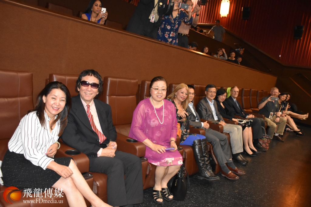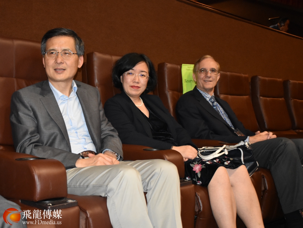 中国驻休斯敦总领事馆副总领事刘红梅(中)、文化参赞谢飞、电影中的法官饰演者一起观看电影。