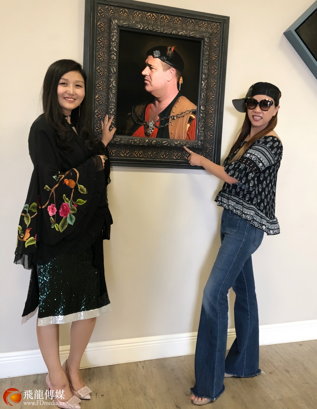 (左)《水墨大别山》制片人和编剧刘芸畅与美国飞龙国际文化传媒集团总裁、国际辣妈大赛(Hot MaMa)创始人陈铁梅在张要武大师的作品前合影。