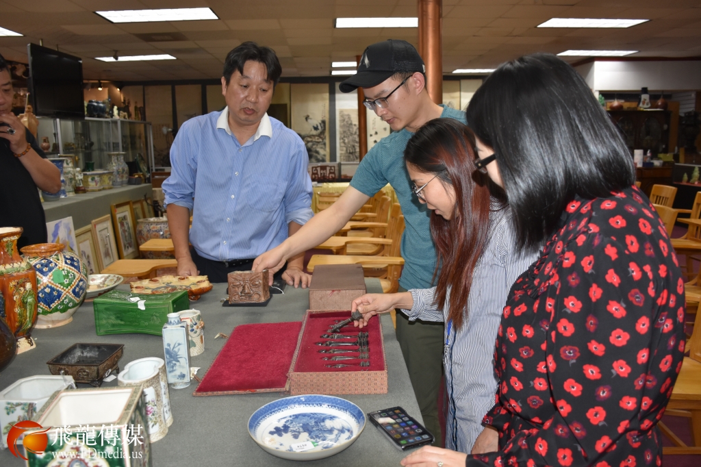 制片人和编剧刘芸畅女士与剧组人员到休斯敦古董拍卖公司参观,古董拍卖公司总裁吴因潮先生亲自接待,著名画家张要武、房地产专家刘妍陪同。