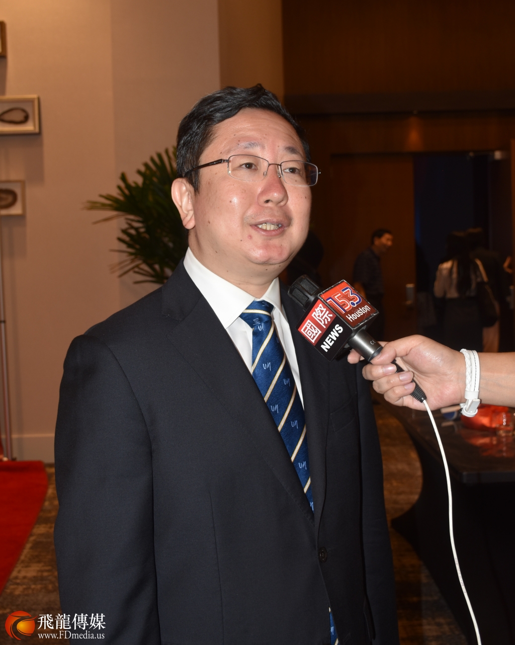 中国驻休斯敦总领馆王昱副总领事接受电视台记者的采访。