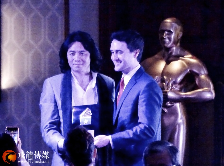 《心无国界》制片人、美中电影电视发展基金会主席 查忠华上台领奖。