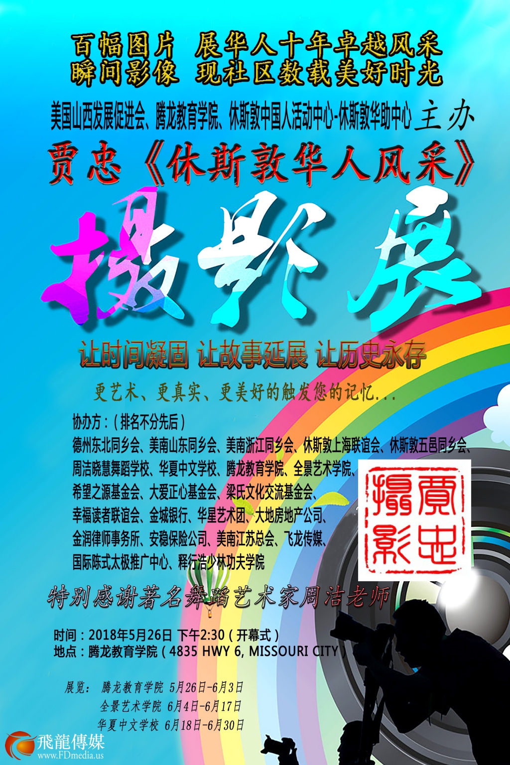 2018贾忠《休斯敦华人风采》摄影展,特别感谢著名舞蹈艺术家周洁老师和她的周洁艺术基金和美中国际艺术教育联盟,以及休斯敦侨界二十多个侨团的大力支持。此次摄影展览的作品将举行义卖,所得款项除去成本外,将全部捐赠给希望之源基金会。