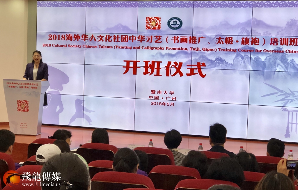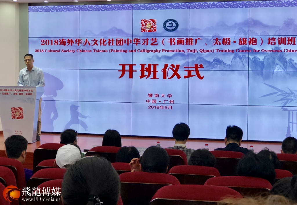 5月11日,2018海外华人文化社团中华才艺培训班在广州暨南大学开课,本期培训班第一次加进了太极及旗袍。中央统战部郑皓、暨南大学负责人、本期培训班各班教授及来自31国家106名学员参加了开课仪式。