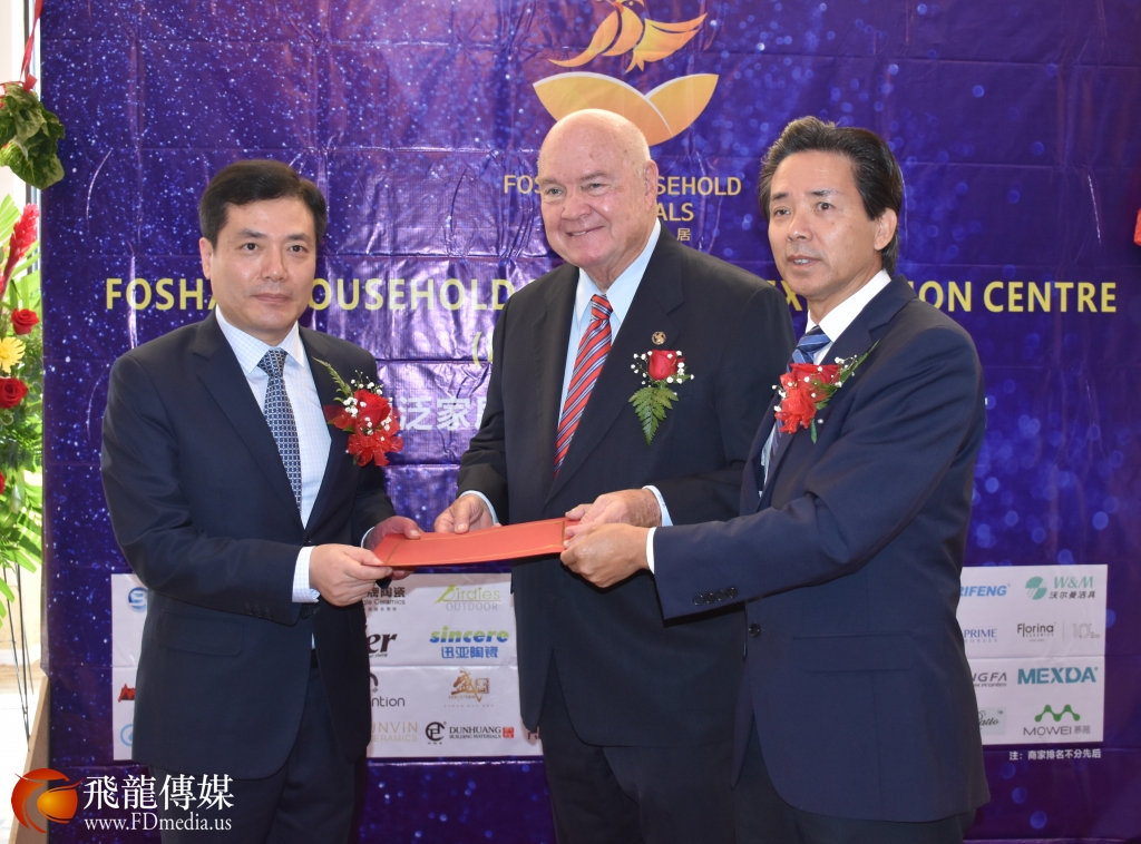 佛山市副市长乔羽、佛山泛家居体验馆美国运营方宇高建材董事长郭秉培接受斯塔福德市市长Leonard Scarcella的褒奖书。