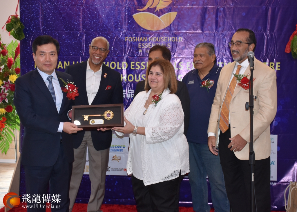 斯塔福德市副市长维吉尼亚·罗萨(Virginia Rosas)带领广州佛山禅城区友好城市德克萨斯州福遍郡的郡长罗伯特·赫伯特(Robert Hebert)等福遍郡一行官员代表市政府颁发“金钥匙”给佛山市副市长乔羽。