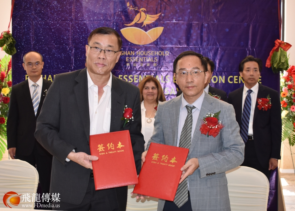 美国德州广东商会 商粤生会长和佛山市禅城区进出口企业商会 苏木豪会长的举行合作签约。