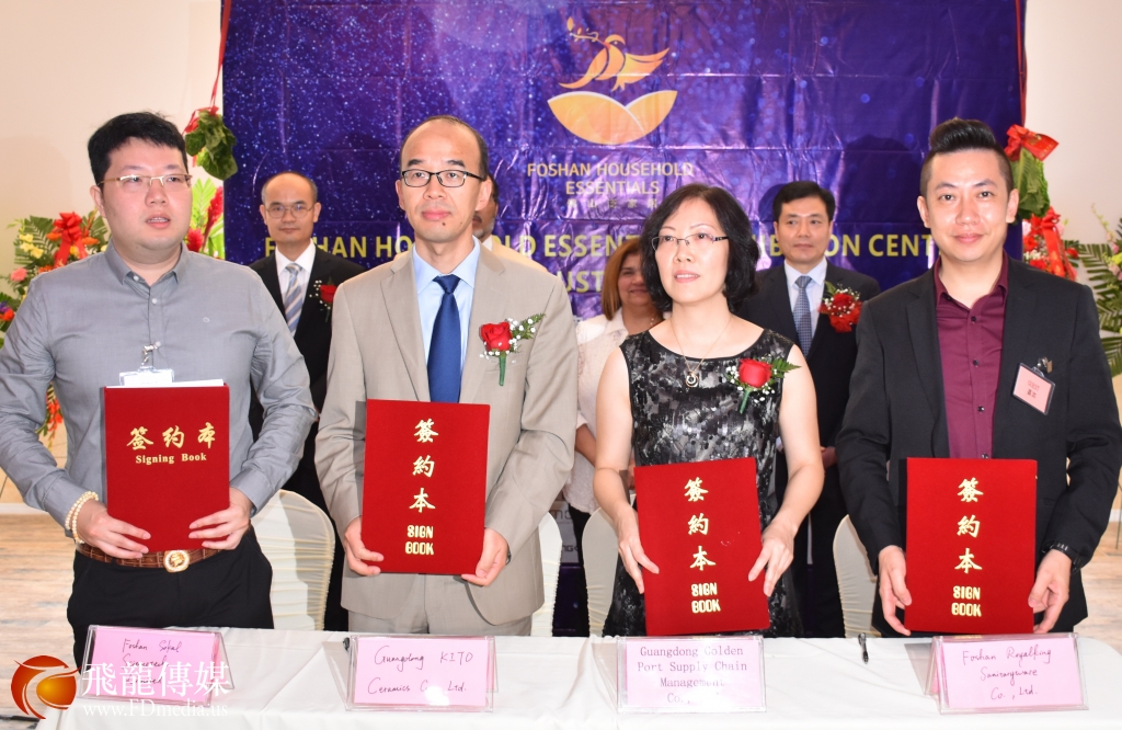宇高建材公司董事长郭秉培和进驻美国馆的佛山市浪鲸洁具有限公司销售总监曾涛、广东金意陶陶瓷集团有限公司国际营销中心总经理白宏林、佛山市索卡尔科技有限公司索卡尔水件五金总经理许蔚签约。