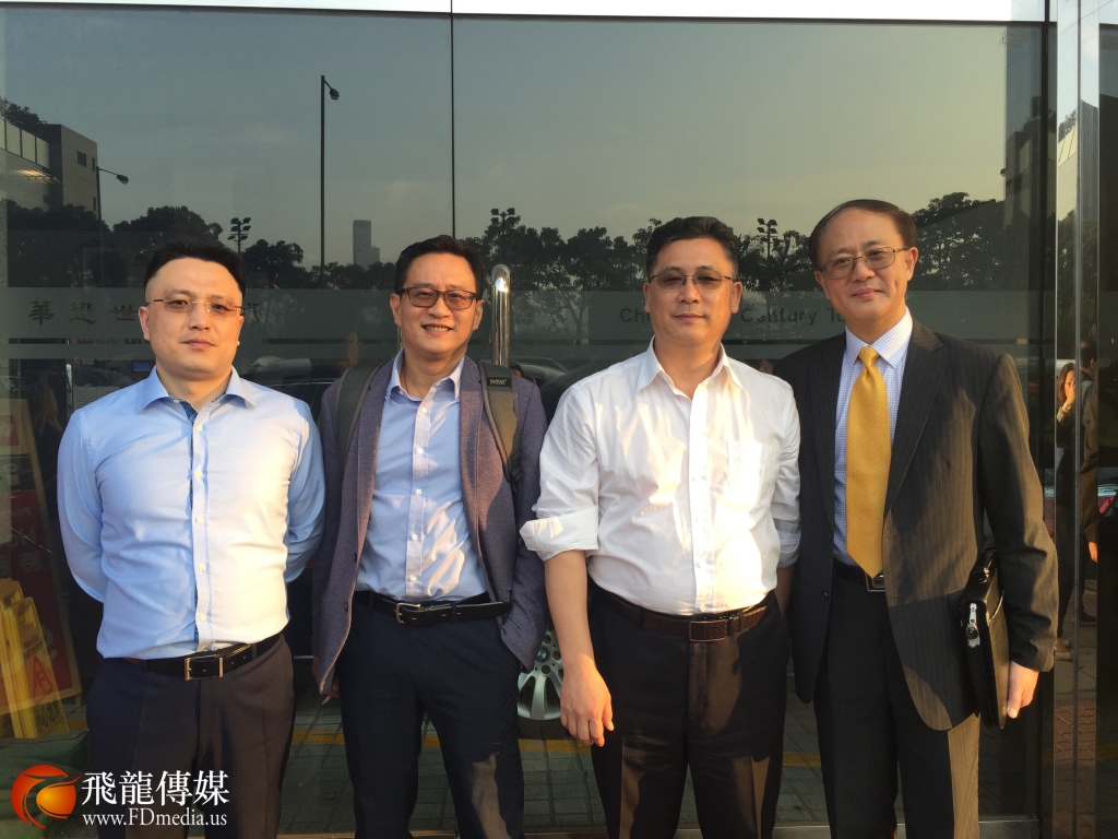 专访结束后,朝鲜驻香港总领事馆代表与《震海听风录》节目组合影。左起:朝鲜驻香港领事李明学、凤凰卫视专题节目总监沈飞峰、朝鲜驻香港总领事张成铁、主持人邱震海(凤凰卫视 供图)