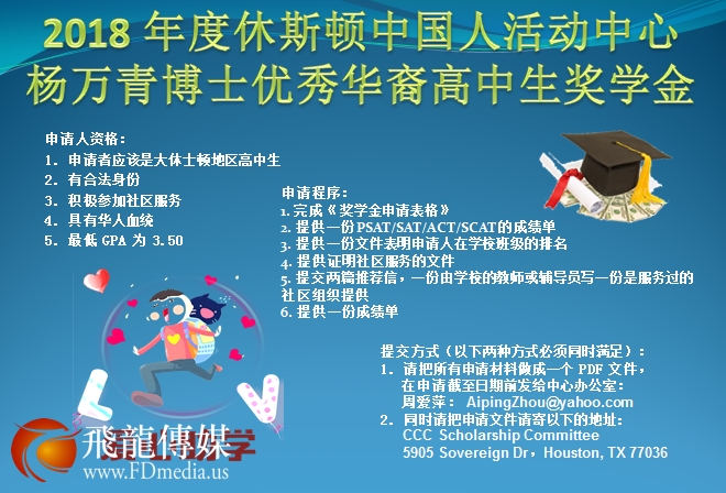 优秀是一种习惯,中学时代是养成这种习惯的最重要的阶段。教育家陶行知先生说过:一切的学问,都要努力向着人民的幸福瞄准、道德是做人的根本,根本一坏,纵然你有一些学问和本领,也无甚用处。为鼓励休斯敦华裔“勤奋好学、积极向上、热心社区、关爱他人”的热情,中国人活动中心特此成立华裔高中生基金会。中心基金会与杨万青博士合作将于2018 年继续设立“杨万青博士优秀华裔高中生奖学金”,该奖学金用来奖励优秀华裔高中生,鼓励他们树立正确的生活态度,努力做一个对社会有益的人,帮助他们为日后的求学、求职和生活打下良好的基础。