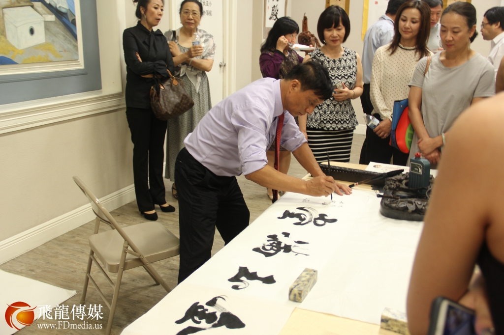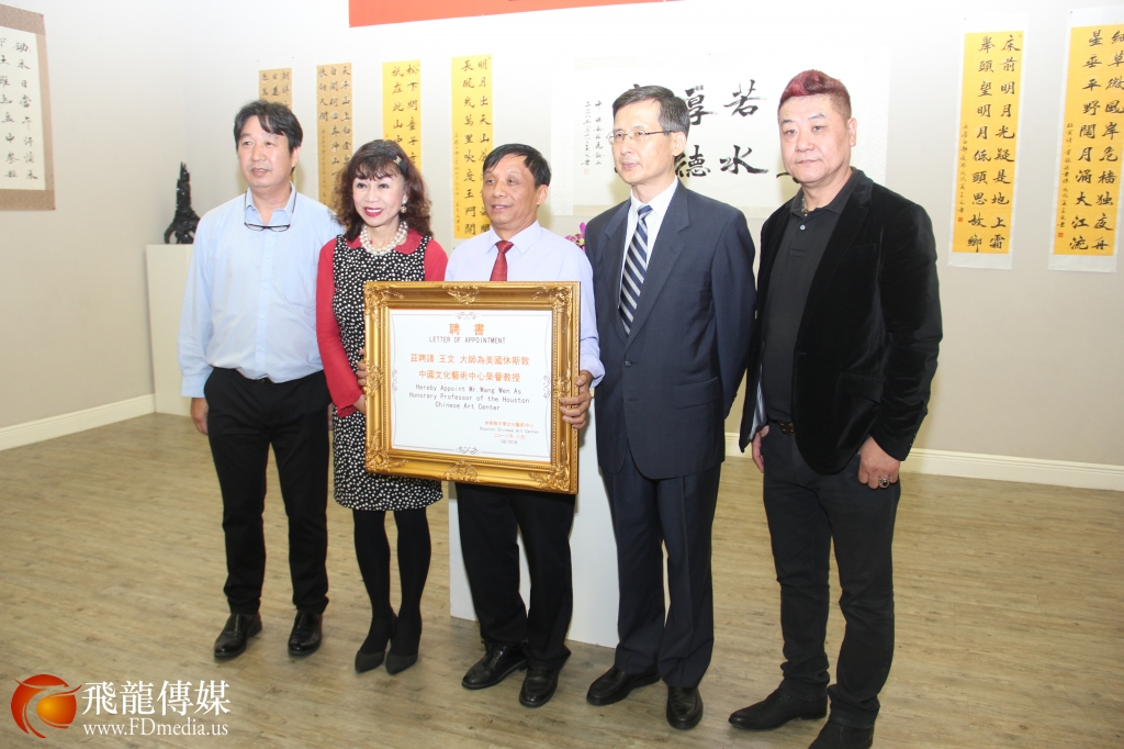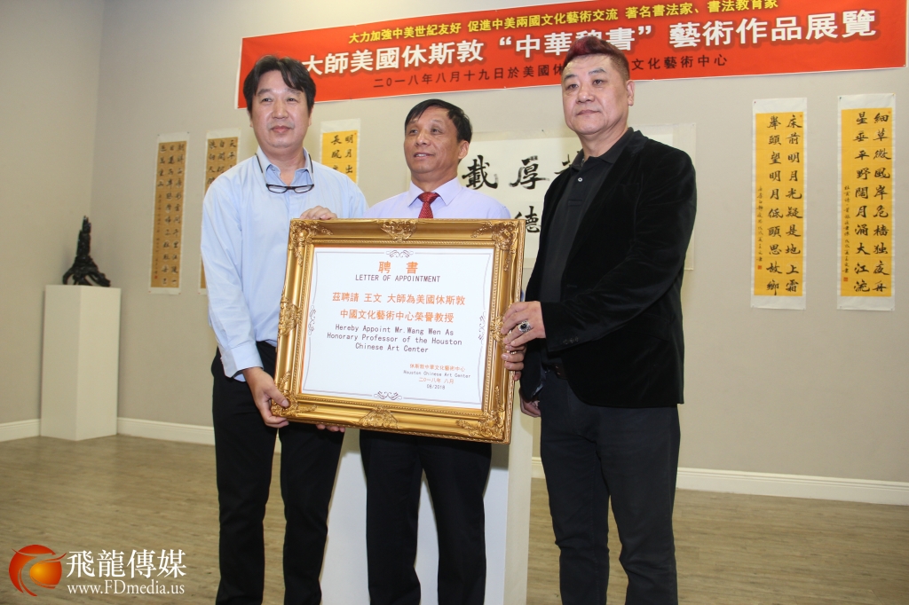 (本报记者Jacky Ciou休斯顿报道)《王文大师中美世纪友好书法作品大展》于8月19日晚6时30分隆重开幕,数百宾客前往张要武艺术中心观展,大家对王文大师的书法作品给与很高的评价。休斯顿美国中国文化艺术中心会长吴因潮,著名画家张要武还借此机会特别聘请王文大师担任该中心荣誉教授一职。