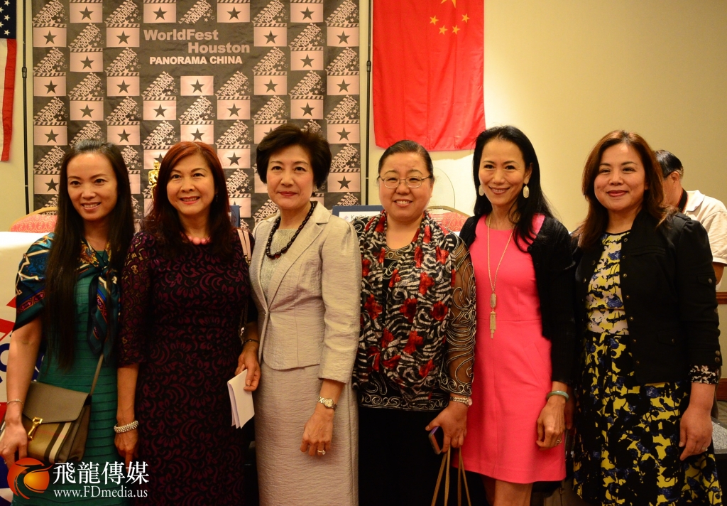左起:旅美作家赵美萍、著名房地产经纪人美美、著名影星陈烨、旅美作家陈瑞琳、莱斯大学第一夫人孙月萍、幸福读书会会长陈霞应邀参加电影节新闻发布会