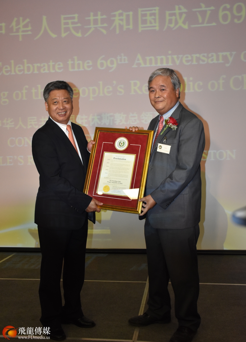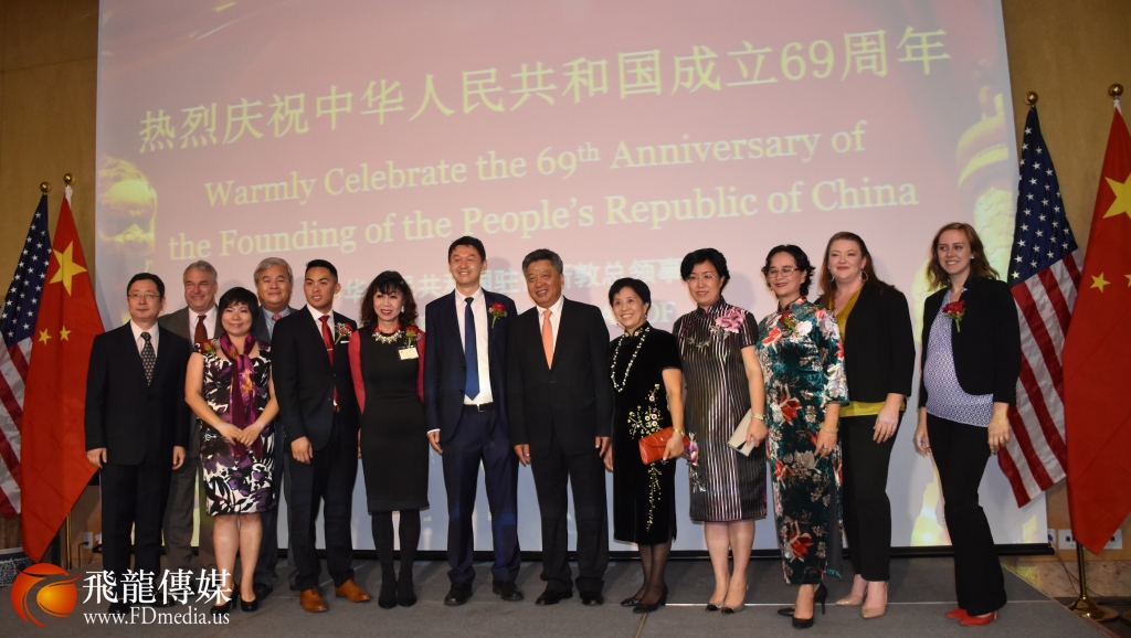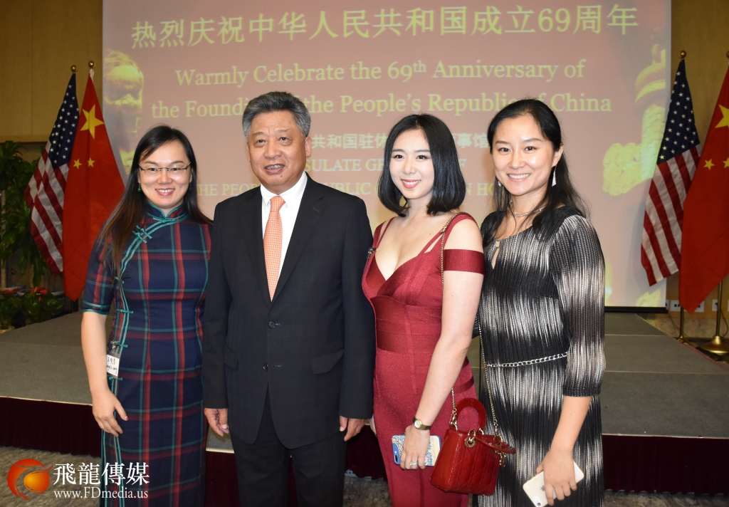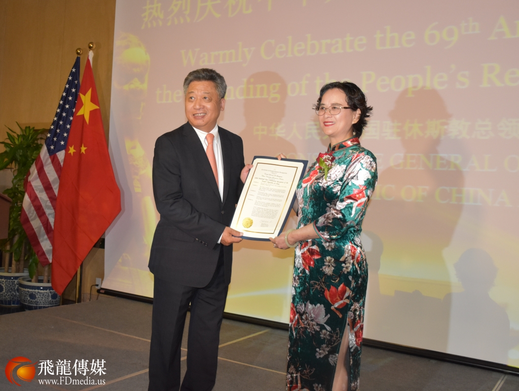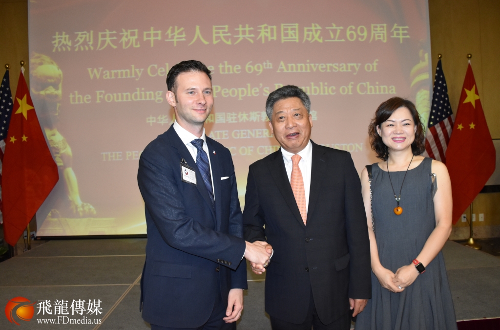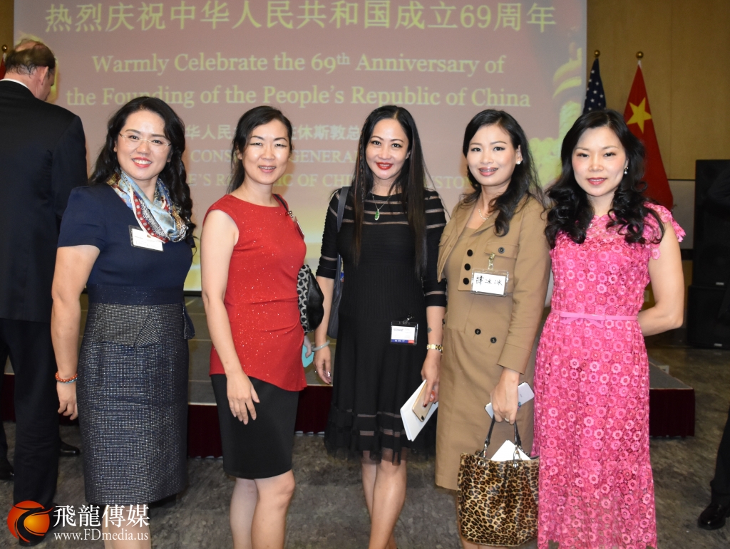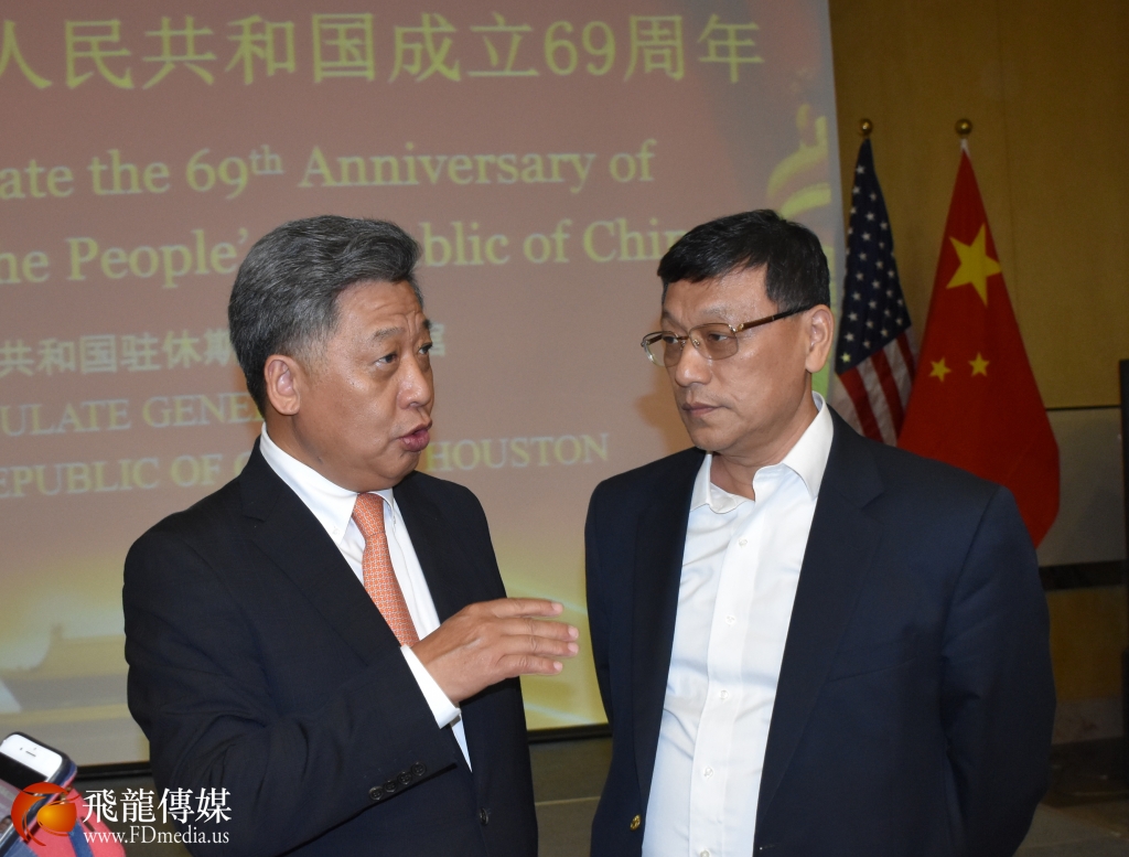 9月26日晚,中国驻休斯敦总领馆举行国庆招待会,庆祝中华人民共和国成立69周年。休斯敦市议员Jack Christie、布什家族代表尼尔·布什(Neil Bush)、美国联邦众议员希拉·杰克逊-李(Sheila Jackson Lee)代表罗玲、皮特·奥尔森(Pete Olson)亚裔事务外联部部长张晶晶,艾尔·格林(Al Green)的亚裔代表谭秋晴,德克萨斯州州长格雷格·雅培(Greg Abbott)办公室经济发展与旅游部亚太区主任陈中,德州众议员吴元之(Gene Wu)及美南地区政治、经贸、文化、教育、科技、媒体及美南地区华人华侨、中资机构和学生学者代表近500人参加。