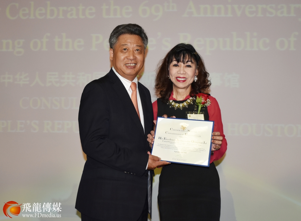 艾尔·格林(Al Green)的亚裔代表谭秋晴带来国会议员的贺函。