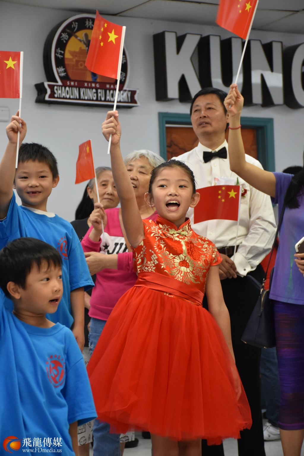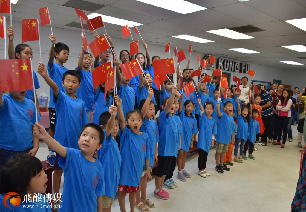 华夏中文学校的小朋友们挥舞着国旗,演唱《龙的传人》。