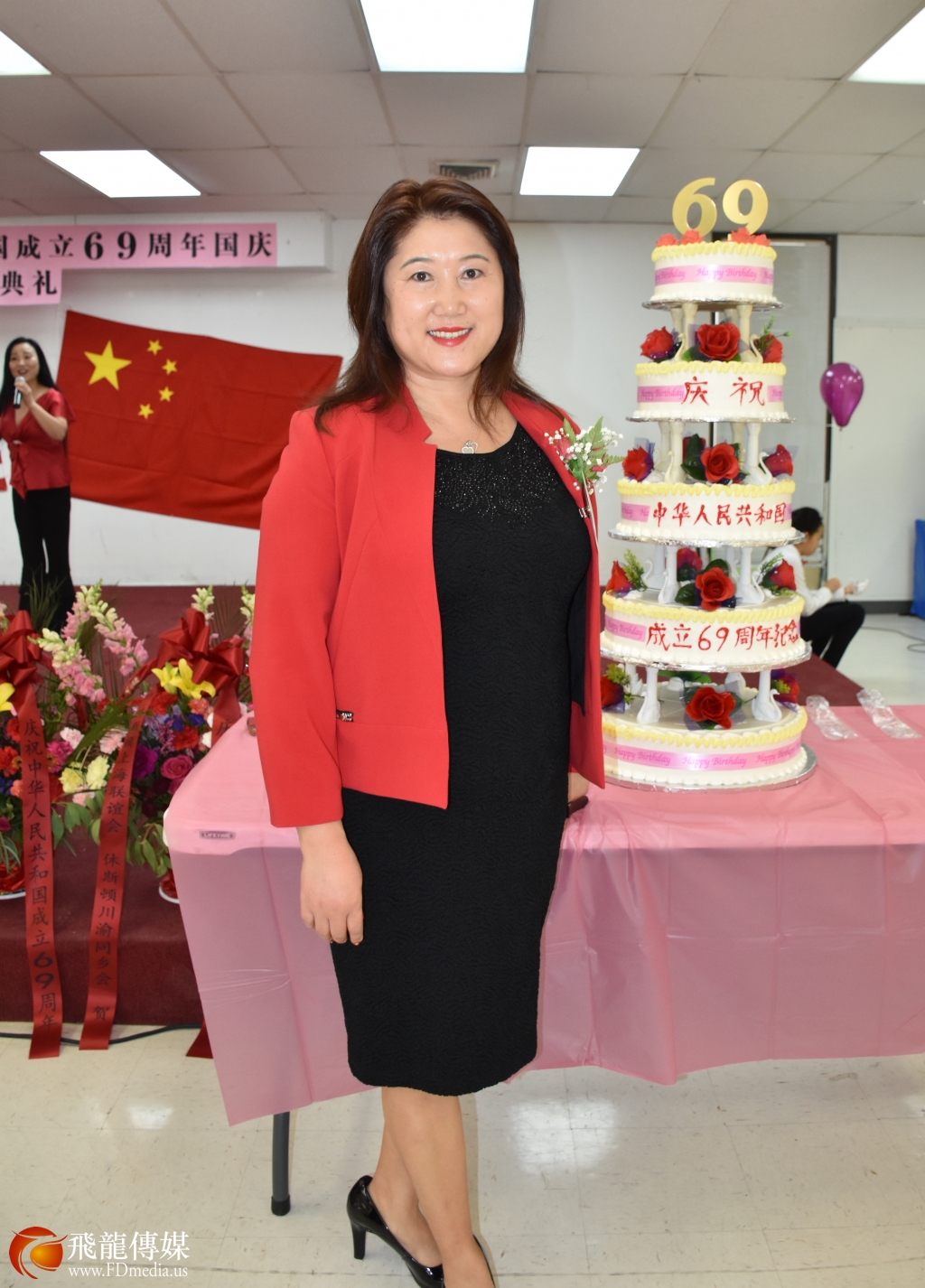 中国人活动中心副执行长刘妍在国庆蛋糕前留影。