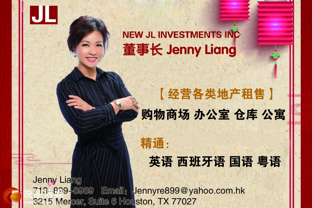 New JL Investments INC 董事长Jenny Liang女士休斯敦地产投资家,拥有公寓、商城、仓库、及多处别墅与地产,在休斯敦企业界非常成功。