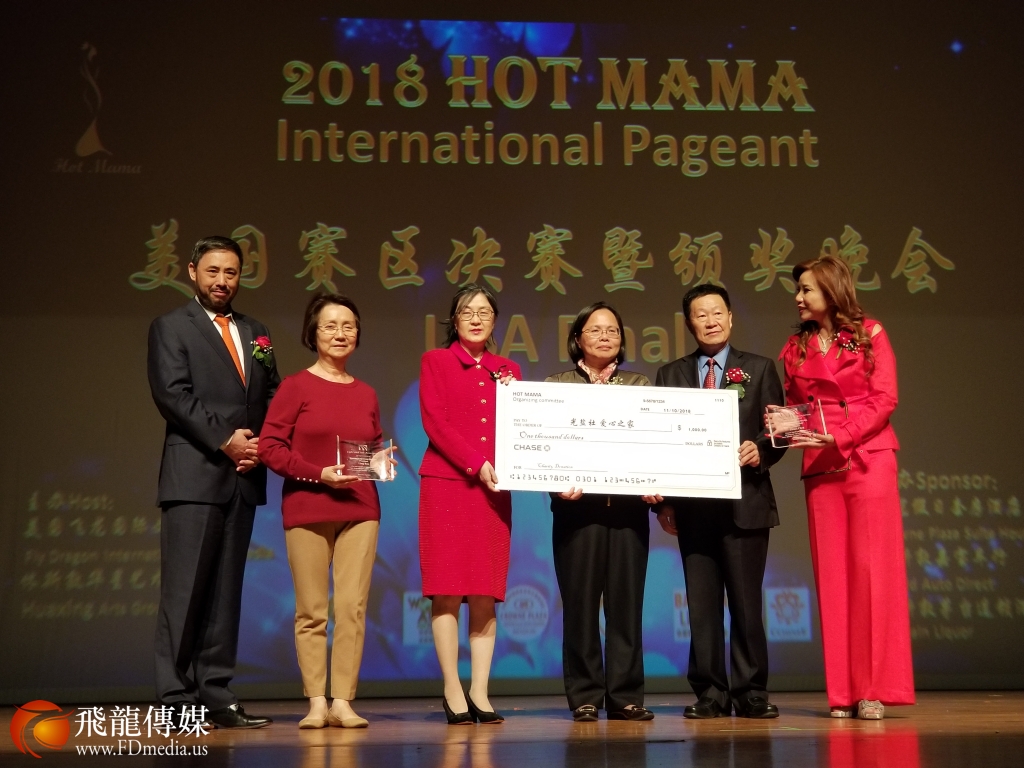 当晚,HOT MAMA国际组委会负责人,大赛总监鲍玲,HOT MAMA创始人陈铁梅捐给休斯敦光盐社的爱心之家,体现辣妈大赛展现自信、关爱社会的的宗旨,光盐社理事长邓福真,执行长Helen Sun上台接受捐款,中国驻休斯敦总领馆易川领事(图右二)、2018 HOT MAMA大赛美国赛区颁奖晚会主席徐宁波(图左一)受邀见证。