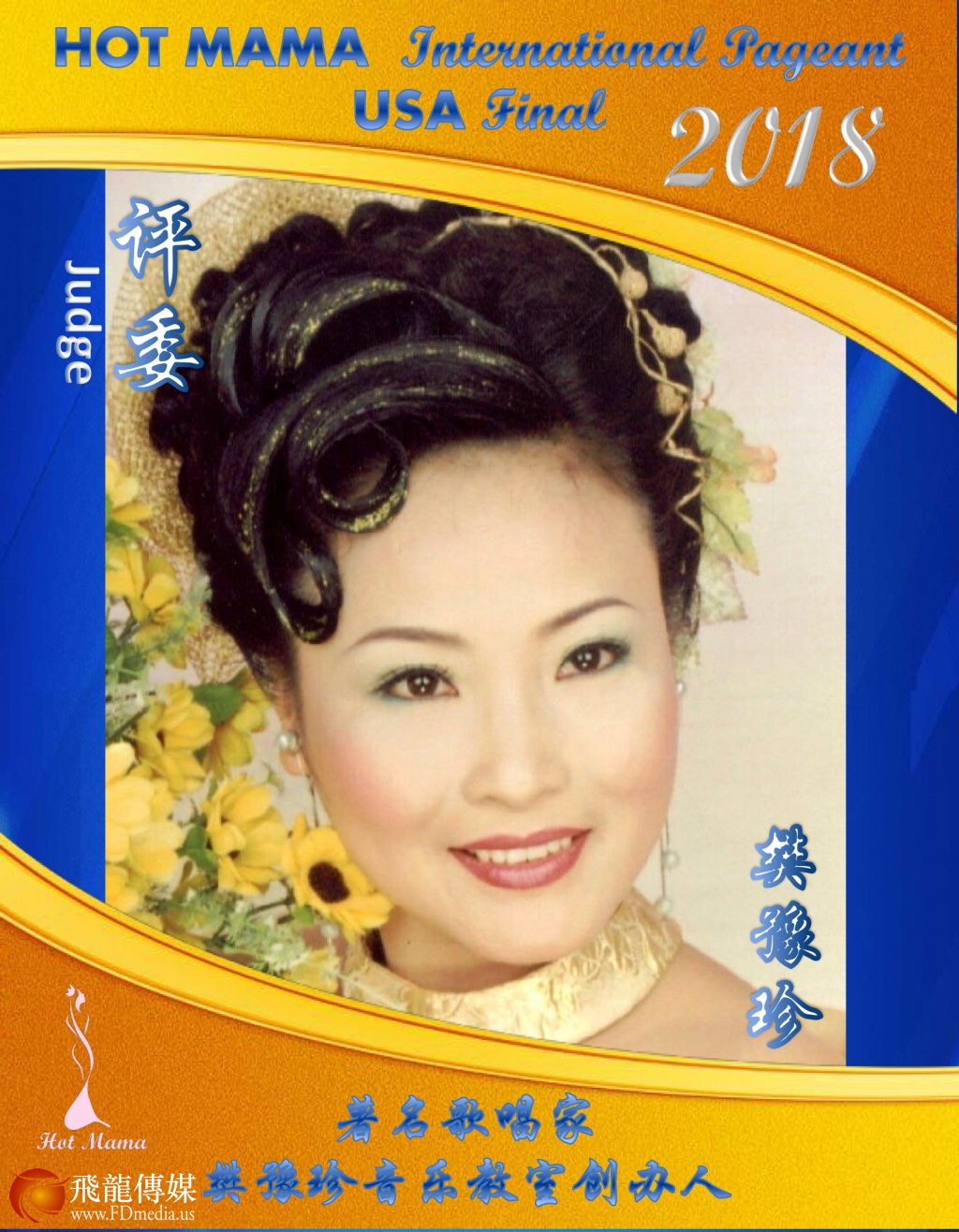 评委 樊豫珍:著名女高音歌唱家,著名京剧表演艺术家。声乐艺术家、京剧表演艺术家樊豫珍老师是中国音乐家协会会员、中国戏曲家协会会员。来美前为中国苏州市中山进修学院声乐教师,培养专业歌手。1981年获全国京剧汇演青年演员一等奖。1991年进入江苏省南京市艺术学院深造,专攻声乐。其间拜著名歌唱家王昆为师,受到著名声乐教育家周小燕教授、金铁霖教授亲自指导。1995年获沪、宁、苏、杭专业民歌大赛一等奖;2001年获江苏省戏曲大赛一等奖;2002年获江苏省歌曲大赛一等奖。2003年以来,在美国多个城市的大舞台上,以韵味十足的京剧唱腔、清澈明亮而又充满激情的极具穿透力的女高音给观众带来了一次又一次的艺术享受。