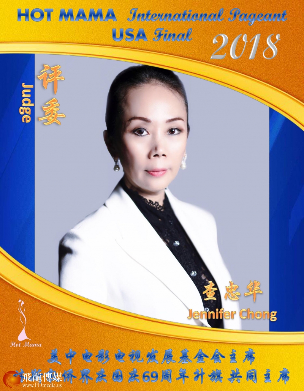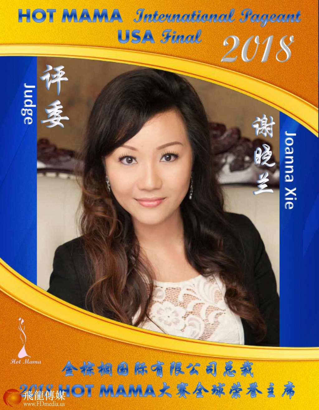 评委 谢晓兰:金棕榈国际有限公司总裁、2018 Hot MaMa全球荣誉主席,1997-1999年连续三年全国大学生舞蹈大赛冠军、王菲模仿歌唱大赛广东赛区的亚军,不久前担任休斯顿歌唱比赛的评委-年轻美丽的女企业家。