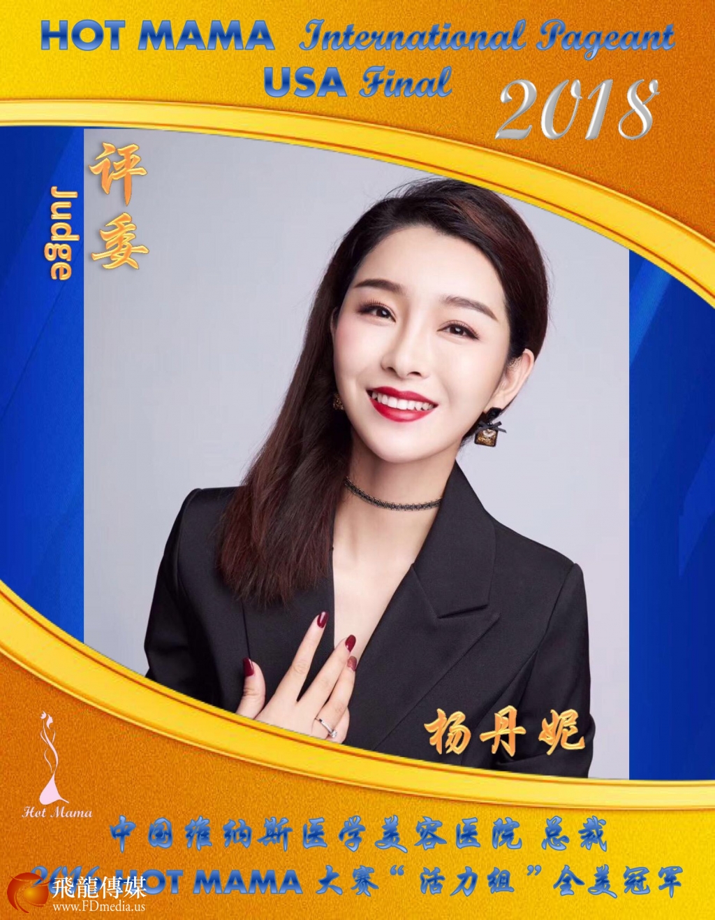 评委 杨丹妮:广州维纳斯医疗美容创始人,自信美医疗美容服务有限公司董事长,2018 HOT MAMA 中国•广州赛区主席 2016 HOT MAMA 活力组冠军。曾与黄晓明搭档出演电影,也曾在南航担任空姐,目前在广州投资了一家高级医学美容医院,开创新的事业路程。
