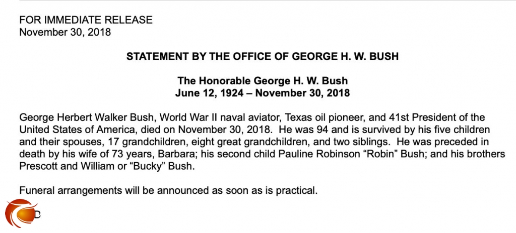 美国第41任总统乔治·赫伯特·沃克·布什于周五晚上(11月30日)在休斯顿逝世,享年94岁。白宫降半旗致哀。