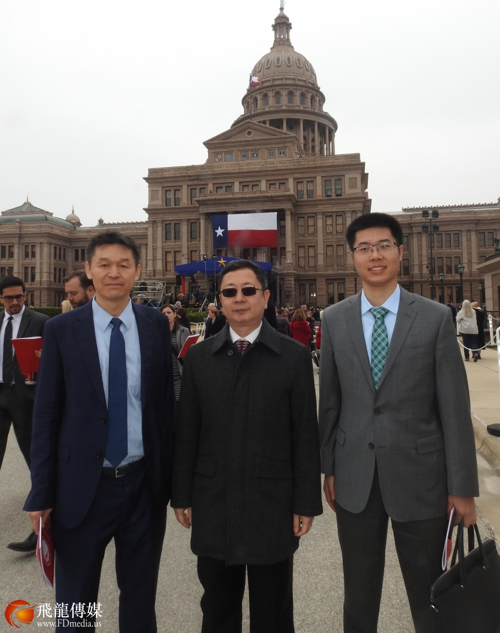 中国驻休斯敦总领馆王昱副总领事(中)应邀出席州长就职典礼,图左为德州州长办公室亚裔主任陈中。